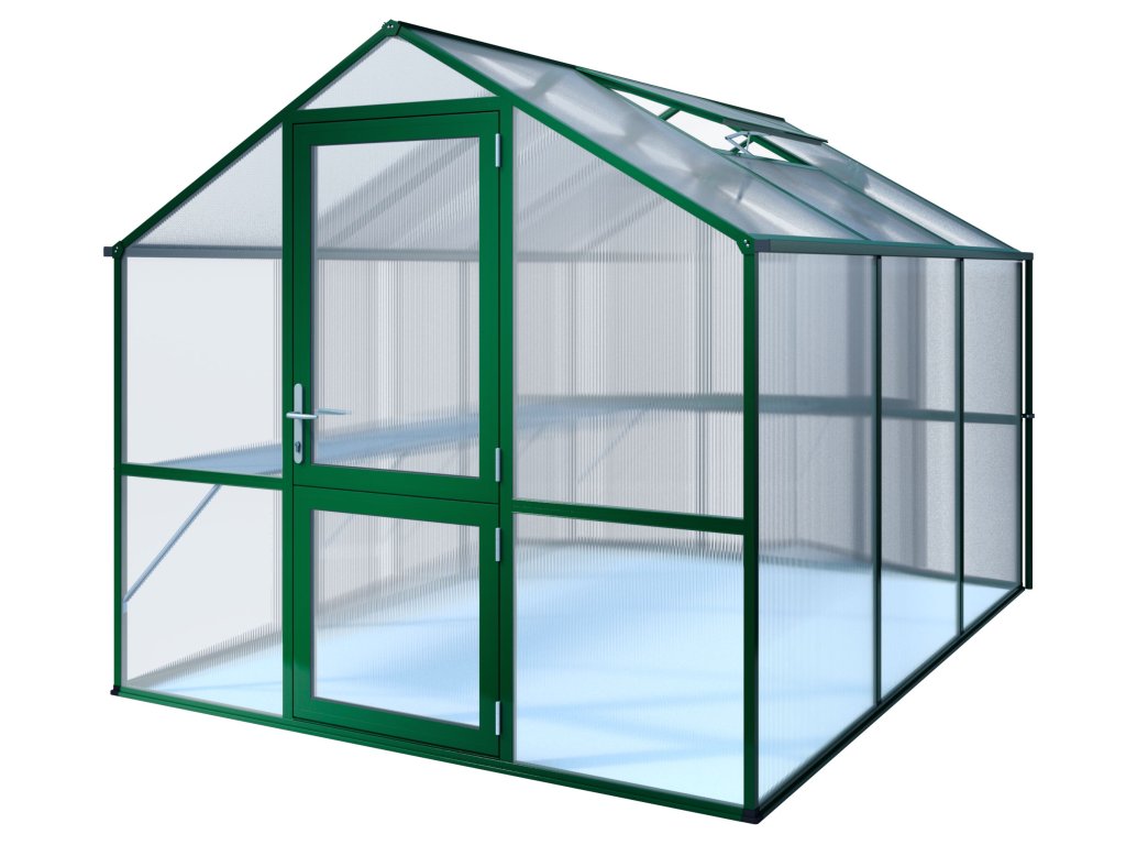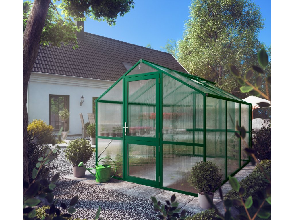 Hliníkový skleník KGT Rose III zelená farba byl špeciálne vyvinut pre náročné hobby zahradníky. Pruhledné dvojité steny ISO o tloušťce 10 mm sú po celém obvodu zcela uzavreny v profilech, takže sa desky ani pri neprízni počasí nemohou uvolnit. K upevnenie nie sú použity žádné sponky ani drobné príchytky – zasklení výrazne zvyšuje stabilitu celé konštrukcie. Dvojité steny nepropouštejí UV zárení, a proto stínení obvykle nie je nutné; zároveň mají vysokou izolační hodnotu, takže sa teplo udrží ve skleníku déle.