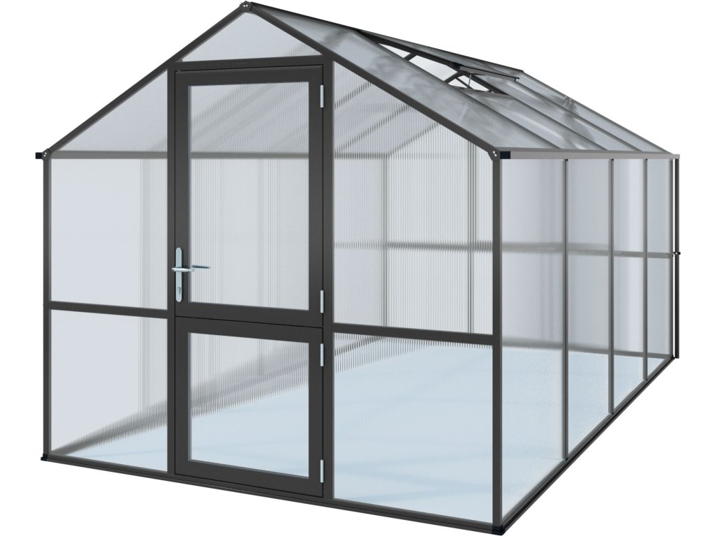 Hliníkový skleník KGT Rose antracit byl špeciálne vyvinut pre náročné hobby zahradníky. Pruhledné dvojité steny ISO o tloušťce 10 mm sú po celém obvodu zcela uzavreny v profilech, takže sa desky ani pri neprízni počasí nemohou uvolnit. K upevnenie nie sú použity žádné sponky ani drobné príchytky – zasklení výrazne zvyšuje stabilitu celé konštrukcie. Dvojité steny nepropouštejí UV zárení, a proto stínení obvykle nie je nutné; zároveň mají vysokou izolační hodnotu, takže sa teplo udrží ve skleníku déle.