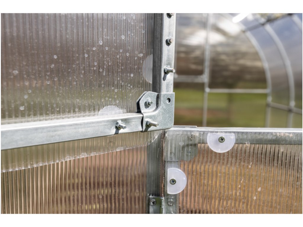 Zasklení skleníku je tvoreno čirým dutinkovým (komurkovým) polykarbonátem o tloušťce 6 mm s UV ochranou, ktorý má zvýšené tepelne izolační vlastnosti, oproti bežne prodávaným skleníkum. Polykarbonát splňuje veškeré podmínky zdravotní nezávadnosti.