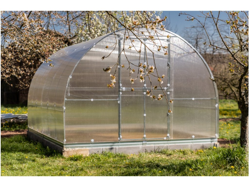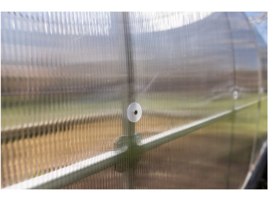 Zasklení skleníku je tvoreno čirým dutinkovým (komurkovým) polykarbonátem o tloušťce 4 mm s UV ochranou, ktorý má zvýšené tepelne izolační vlastnosti, oproti bežne prodávaným skleníkum. Polykarbonát splňuje veškeré podmínky zdravotní nezávadnosti a je na nej záruka 3 roky. Ak si vyberete variantu sa širším prosklením PROFI 6mm, dostanete na polykarbonát záruku až 10 rokov.