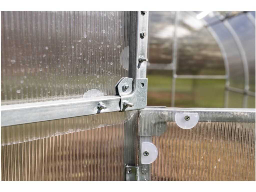 LEGI Basil Profi je vyrobený z ocelových popozinkovaných rúrok hrúbky 20 x 20 mm, ktoré splňují extrémne vysokou kvalitu. zasklenie / Opláštenie skleníku je tvorené čírym dutinkovým (komôrkovým) polykarbonátom o hrúbke 4 mm s UV ochranou, ktorý má zvýšené tepelnoizolačné vlastnosti, oproti bežne predávaným skleníkom. Polykarbonát je odolný UV žiarenie aj bežnému krupobití. K konštrukciu skleníku sa pripevňuje pomocou prítlačných terčov. Polykarbonát spĺňa všetky podmienky zdravotnej neškodnosti. Na polykarbonát máte záruku v dĺžke 3 roky proti poškození krupobitím. Ak si vyberete variantu sa širším Zaskleniem PROFI 6mm, dostanete na polykarbonát záruku 10 rokov.