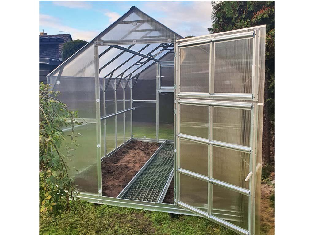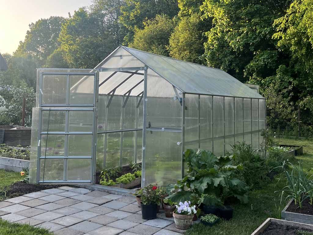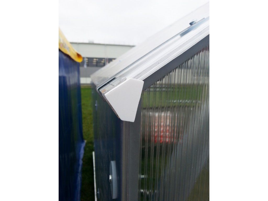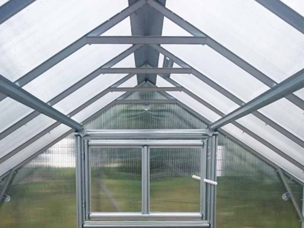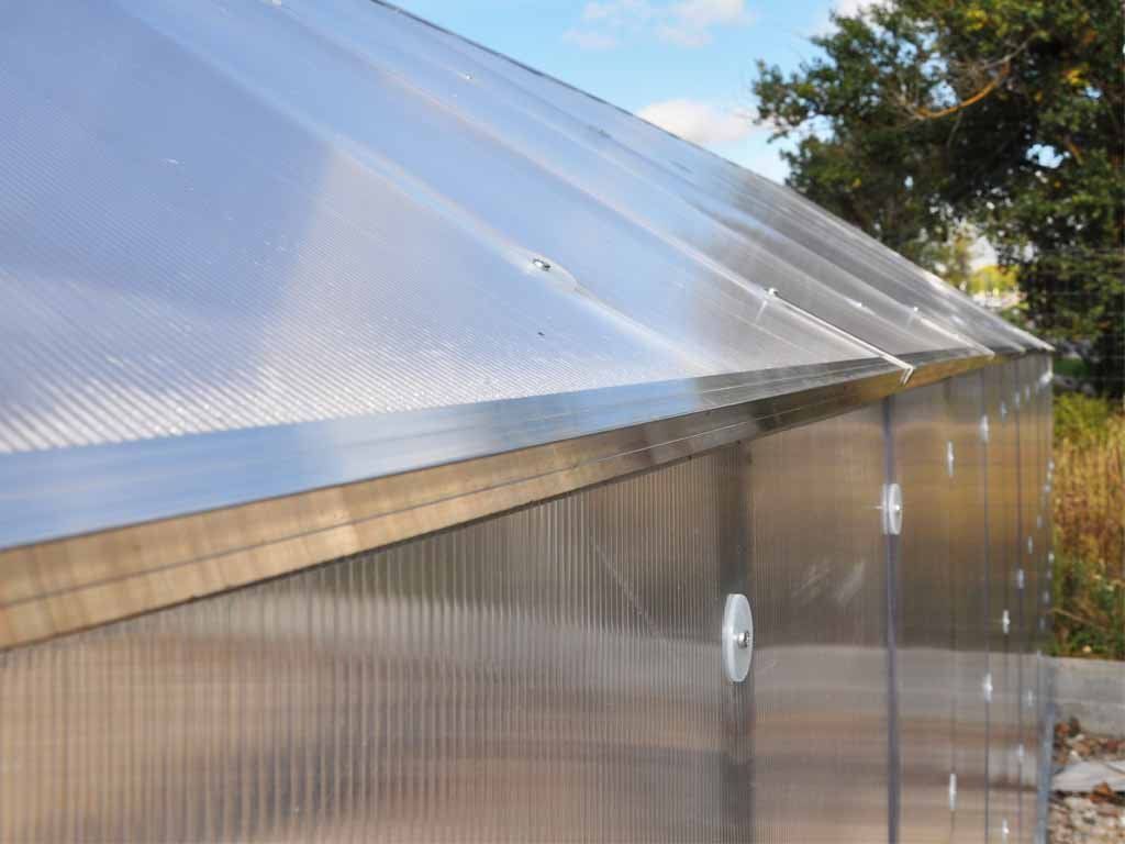 zasklenie skleníku je tvorené čírym dutinkovým (komôrkovým) polykarbonátom o hrúbke 6 mm s UV ochranou, ktorý má zvýšené tepelnoizolačné vlastnosti, oproti bežne predávaným skleníkom. Polykarbonát spĺňa všetky podmienky zdravotnej neškodnosti. Polykarbonátové dosky sú Už vopred naformátované.