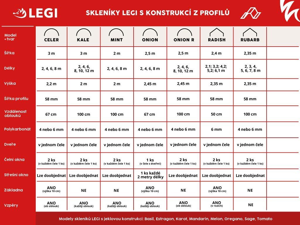 - Ponuku skleníkov LEGI s joklovou pozinkovanou konštrukciou, vrátane obľúbených skleníkov OREGANO, ESTRAGON, TOMATO a ďalších