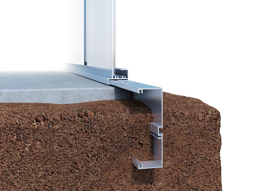 Hliníkový základový rám je užitočným doplnkom. Ak nechcete skleník upevňovať pomocou skrutiek a hmoždiniek alebo ak k tomu nie je vhodný povrch, základový rám zabezpečí stabilné spojenie medzi skleníkom a zemou. Základový rám sa zahákne pod zemný profil a poté sa jednoduše zakope do zeme. Tým sa vytvorí bezpečné, všestranné spojenie so zemou. Ušetrite si čas a prácu s vytváraním betónového základu a použite voliteľný hliníkový základový rám. Základový rám je vyrobený z hliníku odolného proti hnití a možno ho i po rokoch odstrániť bez zanechania stôp.