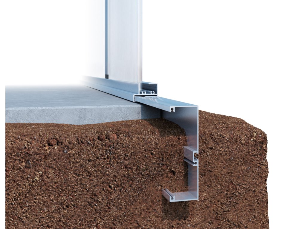 Hliníkový základový rám je užitočným doplnkom. Ak nechcete skleník upevňovať pomocou skrutiek a hmoždiniek alebo ak k tomu nie je vhodný povrch, základový rám zabezpečí stabilné spojenie medzi skleníkom a zemou. Základový rám sa zahákne pod zemný profil a poté sa jednoduše zakope do zeme. Tým sa vytvorí bezpečné, všestranné spojenie so zemou. Ušetrite si čas a prácu s vytváraním betónového základu a použite voliteľný hliníkový základový rám. Základový rám je vyrobený z hliníku odolného proti hnití a možno ho i po rokoch odstrániť bez zanechania stôp.