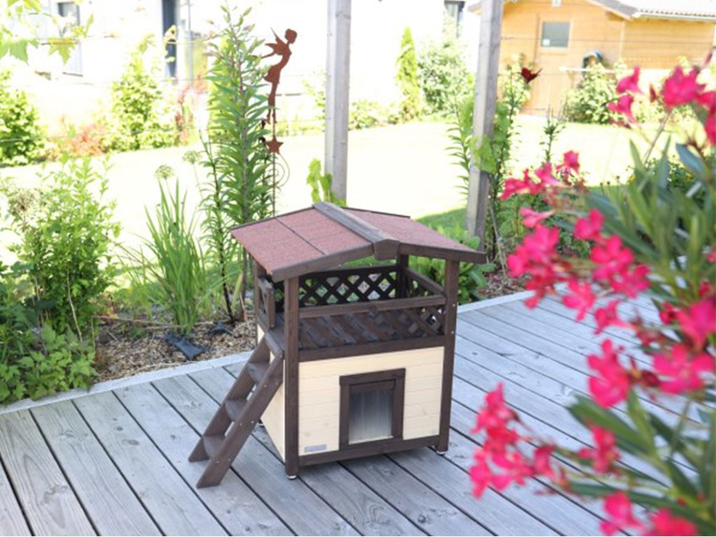 Domček pre mačky zaisťuje bezpečné a pokojné prostredie pre Vašu mačku. Nad domčekom je umiestnená krytá terasa, na ktorú majú maznáčikovia ľahký prístup cez drevené schodíky. Dvierka sú opatrené priehľadnými lamelami, ktoré mačku chránia vo vnútri búdy proti vetru a chladu. Pod podlahou domčeka je nachystaný priestor pre vykurovaciu dosku, ktorú je možné dokúpiť a jednoducho nainštalovať.
