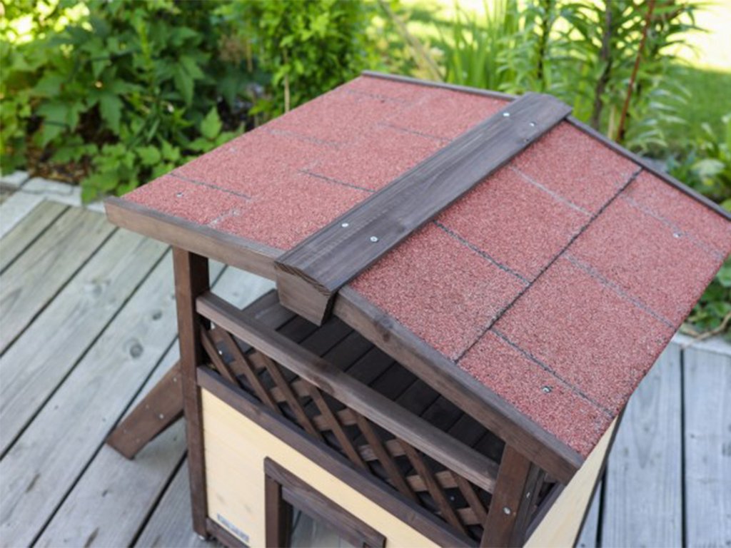 Búda pre mačky vyrobená z dreva je tepelne izolovaná. Izoláciu zaisťujú dvojité steny vyplnené styrofoamom. Strecha domčeka je pokrytá ochranným nepremokavým bitúmenovým materiálom. Napriek tomu odporúčame búdu umiestniť pod prístrešok, aby bola chránená pred dažďom, snehom a slnečným žiarením. Drevený domček je povrchovo ošetrený základným ochranným náterom. Pre dlhšiu životnosť treba, ako pri každom dreve, ochranný náter obnovovať