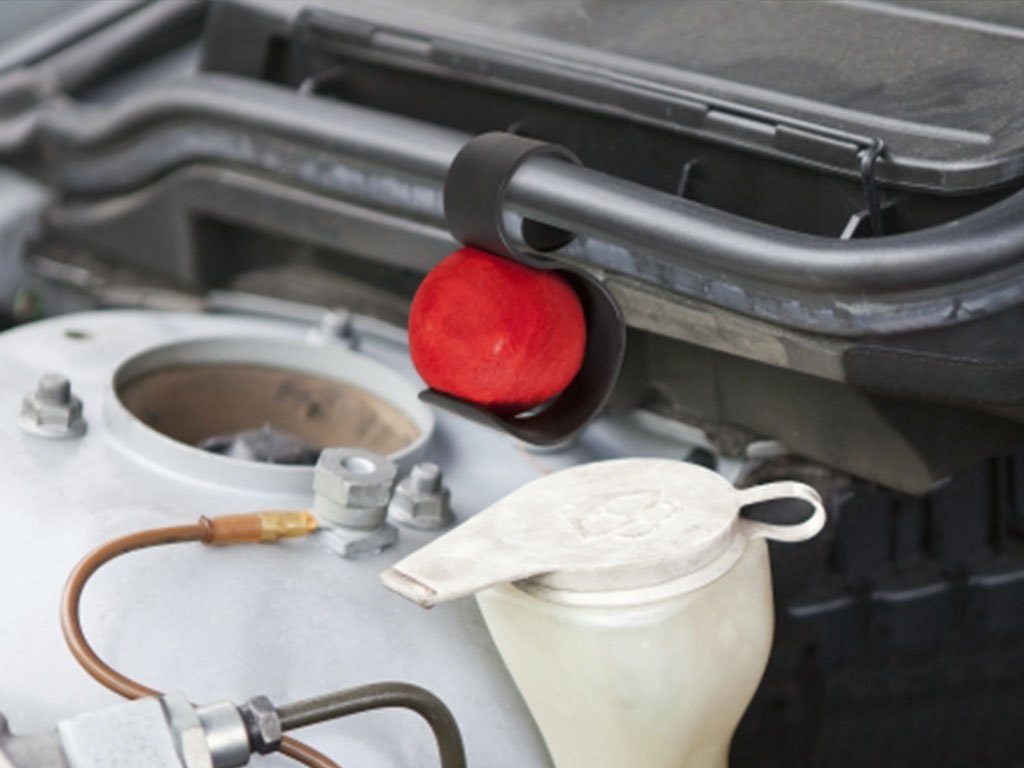 3. Teraz zavesíte držiak na vhodné a suché miesto v motorovom priestore, viď obrázok vyššie. Dbajte na pevné a horizontálne zavesenie držiaka, aby sa počas jazdy neuvoľnil a nespadol.