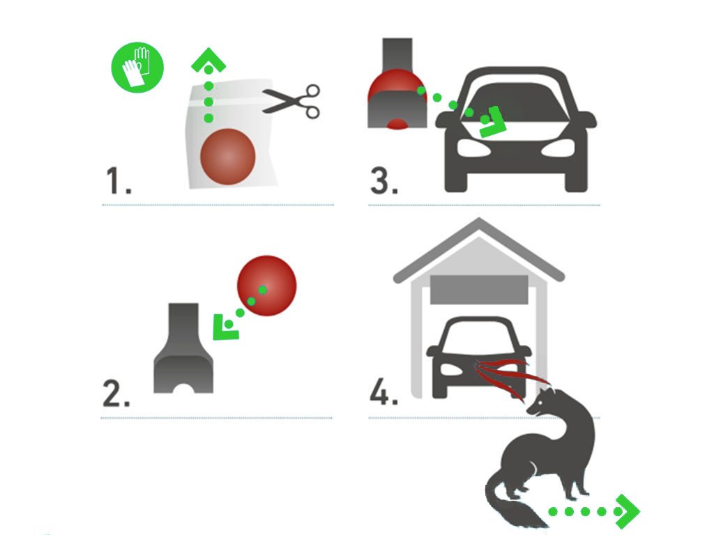 4. Odpudzovací účinok pachovej gule je okamžitý, pretože je vyrobená z celulózy a je nasiaknutá odpudzujúcou látkou, ktorá je pre kuny veľmi nepríjemná, a preto by sa motorovému priestoru mala začať vyhýbať ihneď po inštalácii.