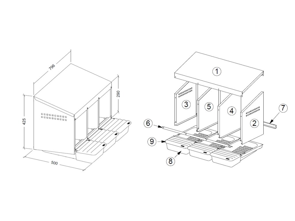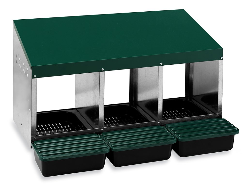 Znáškové hniezdo GAUN pre sliepky so zberným košíkom na vajcia, trojmiestne pre 15 nosníc, umiestnenie na zem, na stenu, ľahká údržba. Ide o skvelého pomocníka každého chovateľa hydiny. Znáškové hniezdo zamedzí rozbíjaniu a znečisťovaniu vajec, pretože dno znáškového hniezda je spádové. Vajcia sa teda po znesení odkotúľajú do zásobníka, z ktorého si čisté a nepoškodené vajcia iba jednoducho odoberiete. Hniezdo môžete jednoducho umiestniť na zem v kurníku alebo zavesiť na stenu. Hniezdo je vyrobené z pozinkovaného kovu s dnom z kvalitného plastu a je veľmi odolné voči nečistotám, a tak jeho údržba a dezinfekcia zaberie len chvíľku.