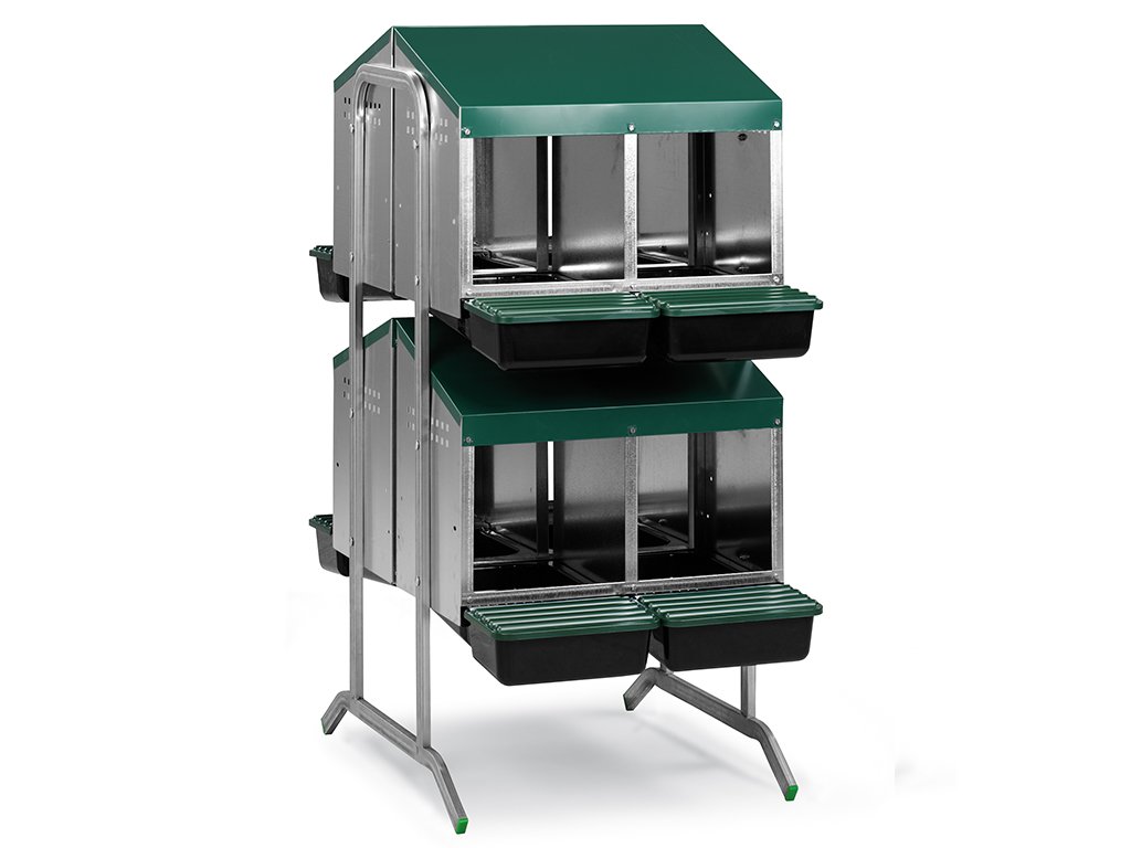Znáškové hniezdo pre sliepky so zberným košíkom na vajcia – 8-miestne, na nožičkách, kapacita až pre 40 nosníc (5 nosníc na jednu kukaň), dno hniezda je šikmé, vajcia sa samy odkotúľajú do zberného košíka, vyrobené z pozinkovaného kovu s plastovým dnom, farba zelená. Hniezdo môžete jednoducho umiestniť na zem v kurníku, veľmi jednoduchá údržba čistoty, rozmery: 105,5 cm dĺžka × 56 cm šírka × 121 cm výška.